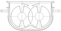 其外殼使用底部為圓形,上部為矩形,殼內排列有2-4根空心攪拌軸,軸與殼體間有密封端蓋。上蓋體