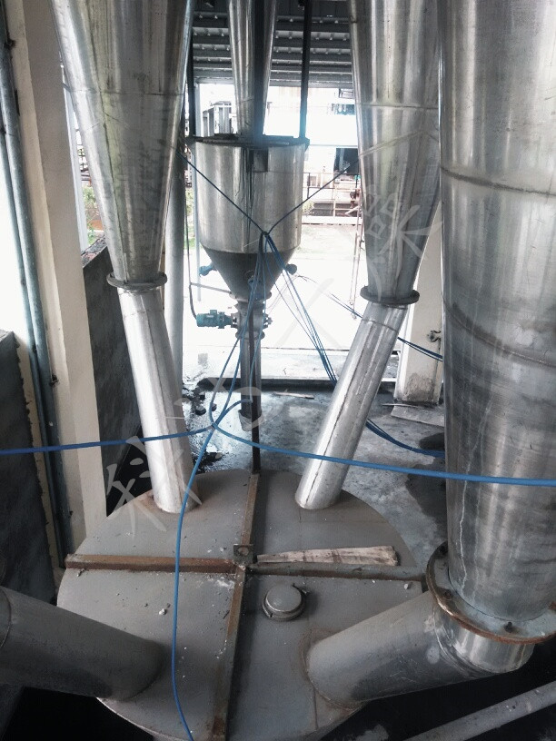 干燥流程完成后,干燥產品懸浮在空氣中,對離開干燥室的空氣中所帶出的干燥產品,一定要有效地加以分散及收回;以保證干燥流程能求得最高產量和防止粉料逸到高氣中造成空氣污染。本機使用一次性收料系統。干成品與空氣的混合物由內置旋風分散后使產品從干燥室底部出來后降落到振動冷卻收料器(冷卻效率≤75)部分產品進入旋風分散器,由分散后,成品干粉經設在旋風分散器下部收料筒收集,含有少量微塵的廢氣從旋風分散器上部出來后進入濕式除塵器,由除塵凈化后經排風機由煙囪排入高氣(需安裝冷凝段)