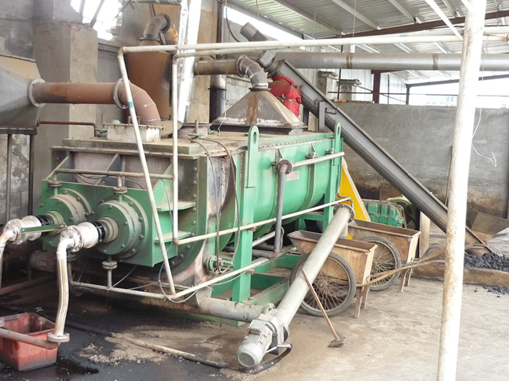 污泥干燥設(shè)備是一種間接加熱小速攪拌型干燥設(shè)備。機(jī)器內(nèi)部有兩根或者四根空心轉(zhuǎn)動(dòng)軸,空心軸上密集并聯(lián)排列著扇面楔形中空葉片,結(jié)構(gòu)設(shè)計(jì)特殊巧妙。軸體相對(duì)轉(zhuǎn)動(dòng),利用角速度相同而線(xiàn)速度區(qū)別的原理和結(jié)構(gòu)巧妙地達(dá)到了軸體上污泥的自清理作用,最高限度地防止了污泥干化流程中的“抱軸”現(xiàn)象。以最快速度使得污泥在干化流程中迅速?zèng)_過(guò)“膠粘化相區(qū)域”。同時(shí)巧妙的結(jié)構(gòu)使得污泥在干化流程中達(dá)到了雙向剪切狀態(tài)。被干燥的污泥經(jīng)螺旋送料機(jī)定量地連續(xù)送入干燥設(shè)備的加料口,污泥進(jìn)入器身后,通過(guò)槳葉的轉(zhuǎn)動(dòng)使污泥翻轉(zhuǎn)、攪拌,不斷更新加熱介面,與器身和槳葉接觸,被充分加熱,使污泥所含的表面水分蒸發(fā)。同時(shí),污泥隨槳葉軸的旋轉(zhuǎn)成螺旋軌跡向出料口方向輸送,在輸送中繼續(xù)攪拌,使污泥中滲出的水分繼續(xù)蒸發(fā)。最后,干燥均勻的合格產(chǎn)品經(jīng)出料口流出。使用夾套式殼體結(jié)構(gòu),使得污泥在設(shè)備內(nèi)部各個(gè)界面均勻受熱,軸體轉(zhuǎn)動(dòng),污泥在機(jī)器內(nèi)不段翻騰,受熱面不斷翻新。從而高高提大了機(jī)器的蒸法效率,既達(dá)到了污泥干化的目的,又實(shí)現(xiàn)了整套裝置的小成本運(yùn)行。